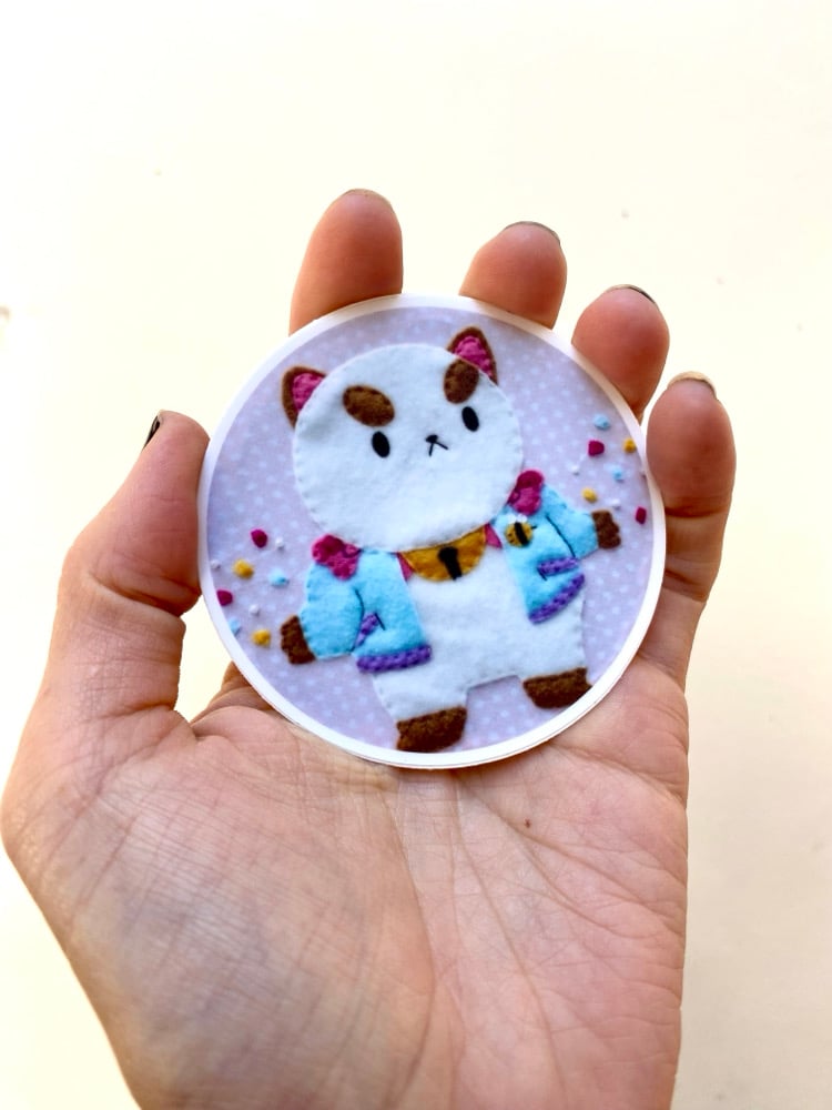 3” vinyl sticker featuring my original embroidery hoop art of Puppycat from Bee and Puppycat!